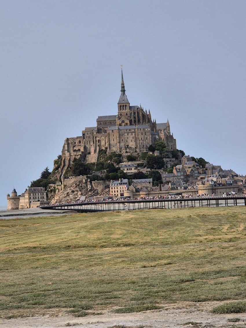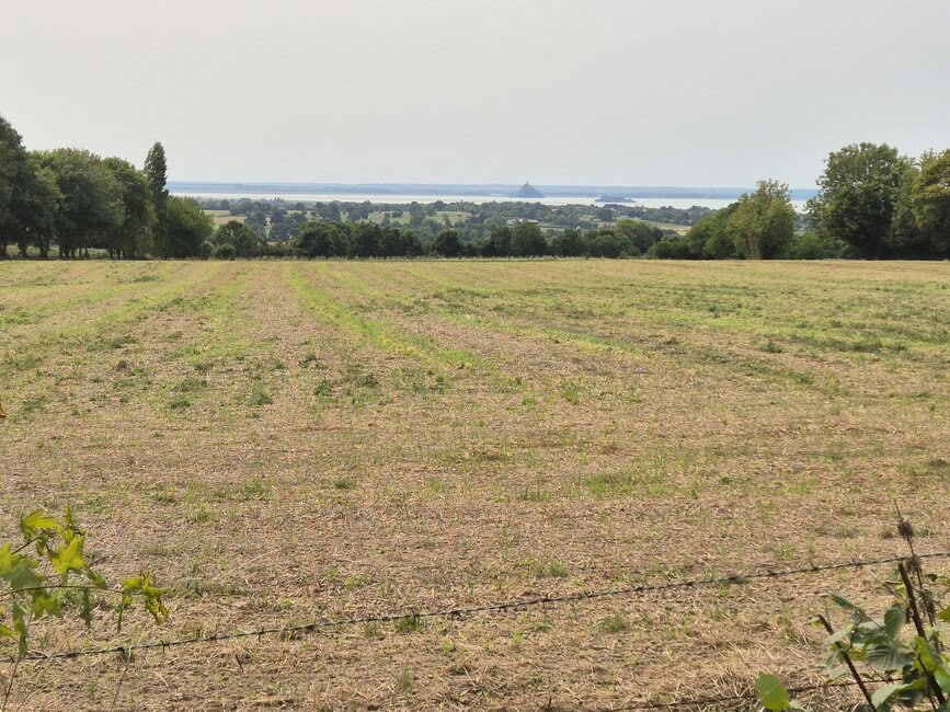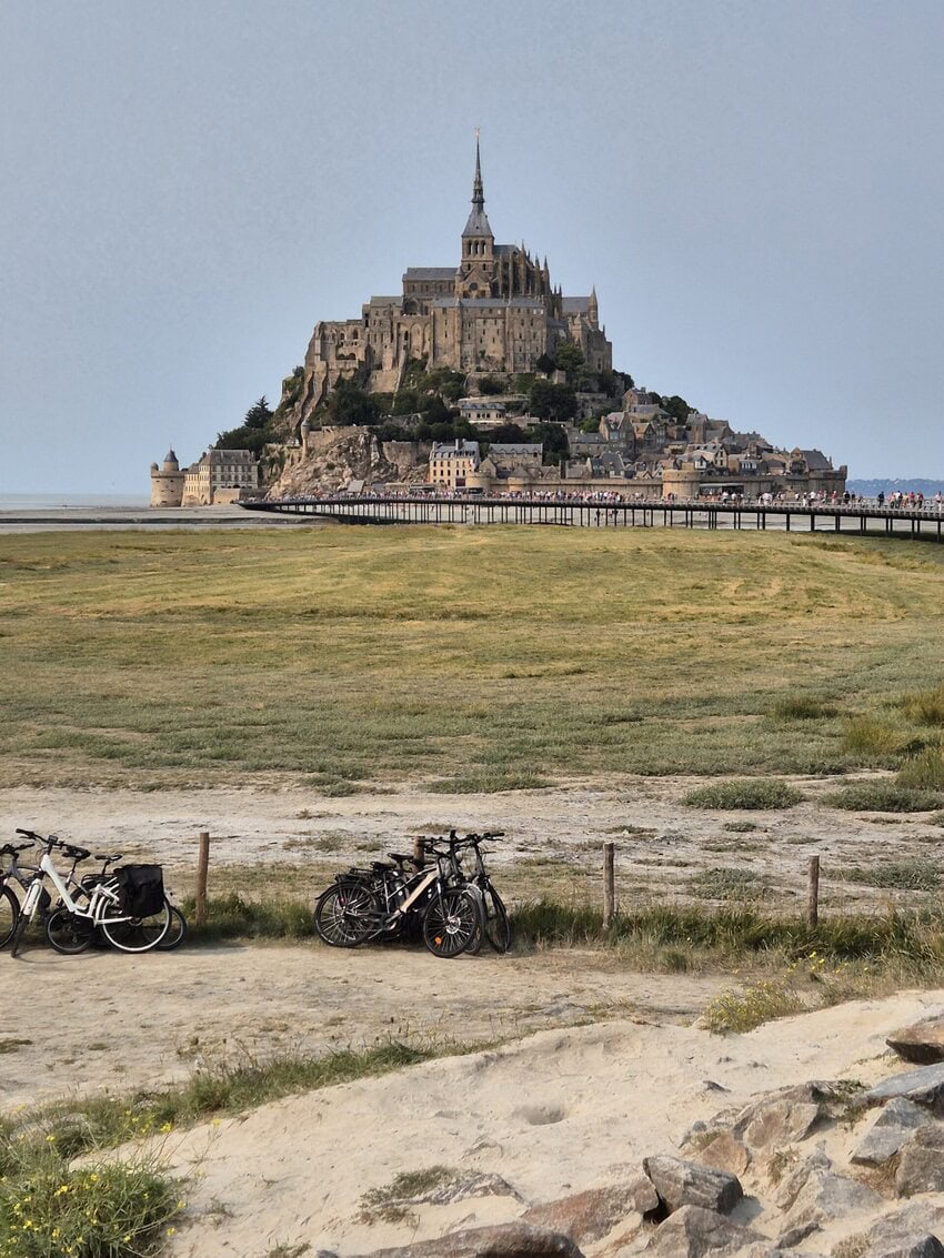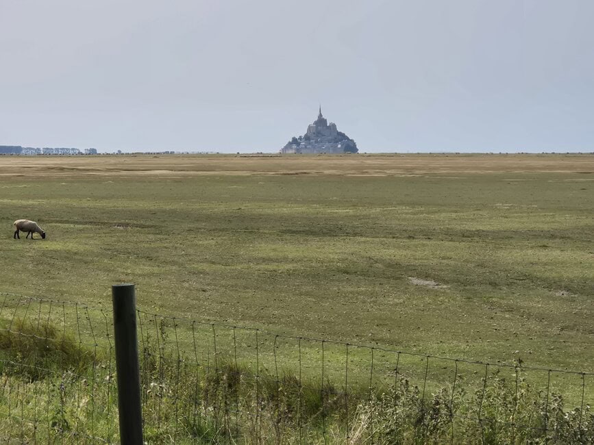Ein Tourhighlight auf welches ich mich lange gefreut hatte, war die Etappe nach Les Couesnons, denn auf dem Weg dahin gab es den Besuch von St.Michel. Dies ist immerhin die am drittmeisten besuchte Attrak-tion Frankreichs. Der Weg dahin führte in einer großen Runde über einen Höhenweg und zahlreiche schöne Abfahrten in die flache Ebene und verschlungene Wege an einer riesigen Schafkoppel entlang. Und dann kam das Ding immer näher. Wie kaum anders zu erwarten versperrte mir ein Schlagbaum den Weg. Nette Zeitgenossen halfen mir den zu umgehen und ich bin dann trotz des eigentlichen Verbotes mit dem Rad Richtung St. Michel gefahren. Mit dem Treiben war ich aber nicht allein, die Idee hatten andere auch. Man lief ansonsten zu Fuß oder nutzen die zahlreichen Busse, die dahin fuhren. Es waren viele tausend Leute unterwegs. Es war wie an einem Bundesligaspiel. Ich bin so nah ran gefahren, wie es für mich gut war, hab Fotos gemacht und machen lassen und bin dann zurück auf meine Etappe gefahren. Mein Tagesziel war nicht mehr weit und führte an einem Kanal entlang, der bei Flut sicher Meerwasser führte.