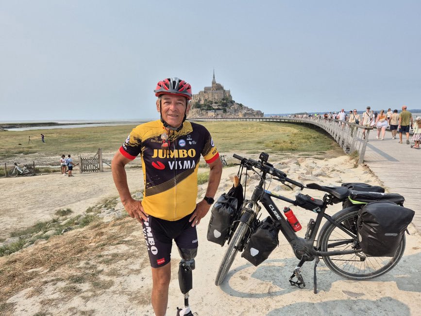In d’Ettenemare hatte ich meinen ersten Pausentag. Ein sehr schöner Platz mit überdachtem Pool, Bistro und fliegenden Händlern, die z.B. Käse anboten. Es war sehr erholsam und am Pausentag hab ich mir die Stadt angeschaut. Samstag ist in Frankreich immer Markttag und da war auch ordentlich etwas los. In den Tagen danach war nicht viel los. Ich kam gut voran, war u.a. auch im Hafen von Le Havre und hatte zu tun da wieder herauszufinden. Danach auf meiner 12.Etappe schickte mich Komoot auf einen Feldweg und der endete auf einem steilen Weg voller tiefer Furchen, Umkraut und massig Steinen. Für mich nicht befahrbar und da ich schon zu tief drin war, gabs auch keinen Weg zurück. Also habe ich mich mit Hilfe der Bremsen Schritt für Schritt den Hang heruntergelassen. Dann kam mal ein befahrbares Stück und ich habe es getestet zu fahren und bin prompt umgekippt und hing dann mit dem Prothesenbein fest im Pedalkorb. Da habe ich mich langsam befreit und hab’s mit dem Fahren lieber sein lassen. Als ich fast unten an der Strasse war, kam doch tatsächlich ein junger Mann mit nem Mountainbike den Weg heruntergefahren. Verrückt. Nun war aber mein Prothesenknie verdreht und das war gar nicht gut. Ich hatte eine Autowerkstatt im Sinn, die über die erforderlichen Drehmomentschlüssel verfügen. Dazu aber noch später.