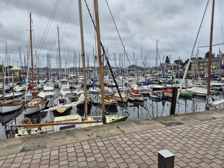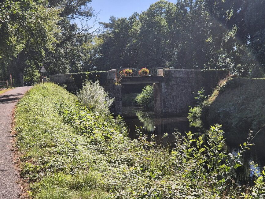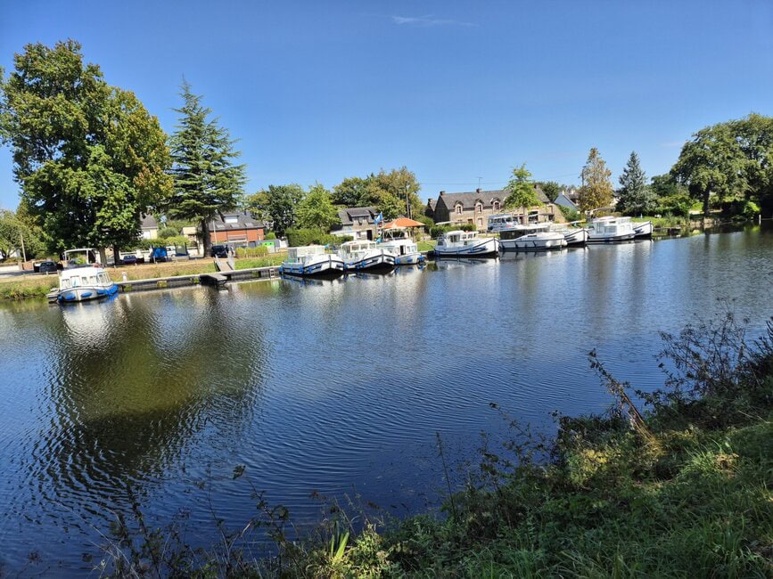 Auch die nächsten Etappen waren schön. Gute Campingplätze, schöne kleine Häfen, ordentliche Radwege und gutes Wetter. Spektakulär war Saint Malo mit dem Hafen und den Stadtmauern. Da war überall Massenauflauf und ein starker Verkehr. Es hat gedauert, da wieder herauszukommen. So richtig malerisch schön wurde es als es Richtung Guegon ging und ich auf den Brest-Nantes-Kanal traf. Mir ist er so nach und nach klar geworden, dass ich nun tagelang nur an diesem Kanal entlang fahren würde. Hunderte Kilometer Kanal, zahlreiche kleine Ortschaften, viele Schleusen, die meisten davon wunderschön hergerichtet und mit massig Blumen bepflanzt. Das sah schon toll aus. Ich kam Sonntags da an und da war offenbar Ruhetag, denn es gab null Bootsverkehr. Ab Montag war dann auf einmal richtig etwas los auf dem Wasser. Das fand ich schon etwas merkwürdig. Der Radweg am Kanal war entweder asphaltiert oder hatte einen festen Untergrund aus weissem Sand, der sich super vor, allerdings auch recht staubig war. Da war auch täglich recht viel Radverkehr. Etwas unschön fand ich die zahlreichen Quengelbalken überall. Gerade an Brücken auf die es oft bergauf ging nicht unbedingt eine gute Einrichtung. Ich bin echt kein Freund von diesen Balken und Gittern, die einen ausbremsen. In Deutschland habe ich das schon mitten im Wald gesehen. Nun ja. Jeder Tag an diesem Kanal war ein Erlebnis. Man denkt, es ist doch eintönig, aber nein, das ist es nicht. Die Vegetation wechselt, das Licht wechselt, überall gibt es Schleusen, Häfen und festgemachte Hausboote oder Schlepper. Das wird nie langweilig. Ich war begeistert.